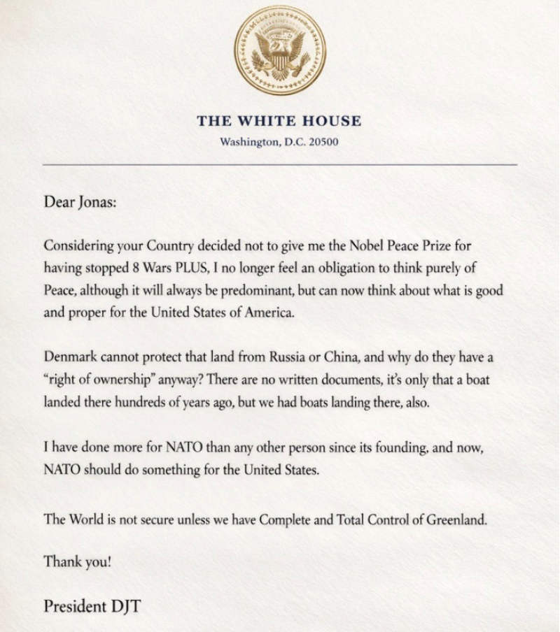 In a letter to Norwegian Prime Minister Jonas Gahr Stoere, Trump wrote the following on January 18, 2026: