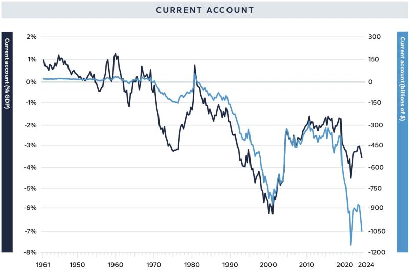 America thus shifted from being a manufacturing empire to a consumer empire in relation to the rest of the world, as illustrated by the sharp deterioration in its current account in the 1990s (see chart below).