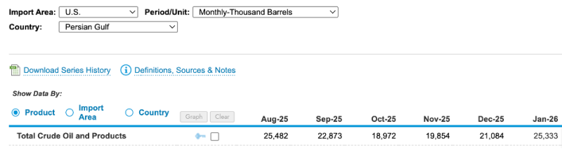 Now there are claims that all these imports come from Canada and Mexico, which is also only half the truth. According to the U.S. Energy Information Administration (EIA), in January 2026 the US imported 25 million barrels of crude oil and other products from the Persian Gulf alone.
