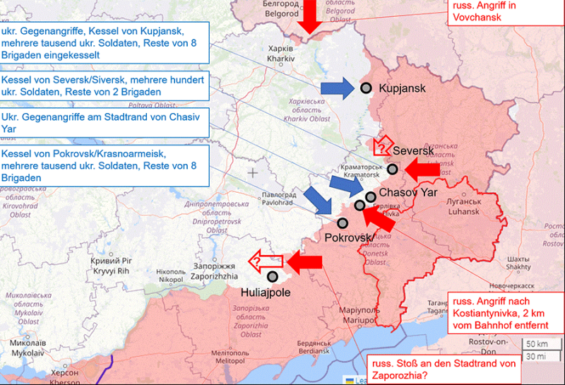 Das Tempo des russischen Vormarsches im Osten der Ukraine hat sich in den letzten Wochen merklich erhöht, fast täglich stoßen die Russen nun bis zu 5 km täglich vor und erobern auch größere Siedlungen mit einer Geschwindigkeit, die man so bisher nicht beobachtet hatte. Insgesamt haben die Russen in den letzten Tagen mindestens in drei Räumen ukrainische Gegenangriffe abgewehrt und ihrerseits an mehreren Orten angegriffen. Es ist davon auszugehen, dass die Russen die Angriffsvorbereitungen der Ukrainer erkannten und sich in der Lage fühlten, mit deren Gegenangriffen fertigzuwerden, ohne selbst Angriffe andernorts abbrechen zu müssen. Damit sind sie auch in den kommenden – möglicherweise entscheidenden Tagen – in der Lage, den militärischen Druck auf die Ukraine zu erhöhen. An mehreren Orten sind mittlerweile ukrainische Truppen im Umfang von mehreren tausend Mann eingeschlossen. Ihnen drohen Tod oder Gefangennahme. Diese ukrainischen Truppen in den Kesseln zu retten, dürfte neben Zeitgewinn derzeit das wichtigste Verhandlungsziel der ukrainischen Regierung sein.