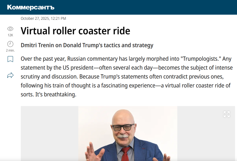Тренин приходит к выводу, что Россия больше не ожидает конструктивных переговоров с Трампом, осознав ограниченность его реальной власти в американской системе, а именно в условиях постоянного влияния «глубинного государства». Тем не менее, взаимодействие Москвы с Трампом — так называемая «специальная дипломатическая операция» — служило стратегической цели: сигнализировать ключевым партнерам, таким как Китай, Индия и Бразилия, что Россия по-прежнему открыта для диалога и, при отсутствии вмешательства Запада или препятствий со стороны бандеровского режима, заинтересована в мирном урегулировании конфликта на Украине. В то же время это успокоило российскую общественность относительно решимости ее руководства и укрепило убеждение, что только военный успех — а не посредничество США и принудительная «дипломатия» — может обеспечить достижение долгосрочных целей России на Украине.