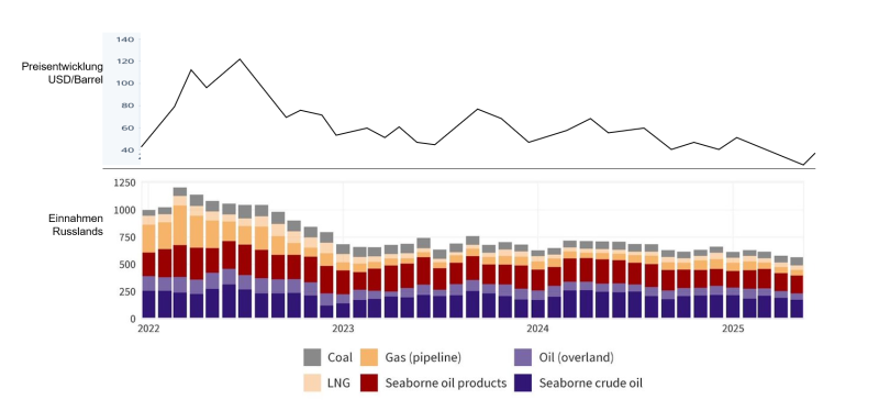 Узким местом в снабжении, по-видимому, является транспортировка всех видов грузов с территории России на фронт, которая наиболее эффективно осуществляется по железной дороге и по рекам (9). О какой-либо кампании против этой инфраструктуры пока ничего не известно. Поэтому можно предположить, что атаки на нефтяную промышленность России направлены на то, чтобы наконец вызвать долгожданное недовольство среди населения страны и заставить его положить конец войне и правлению Владимира Путина в целом. При подобных предположениях в прессе, скорее всего, речь идёт лишь о желаемом, принимаемом за действительность. Кроме того, украинская кампания дронов против российской нефтяной отрасли, возможно, демонстрирует администрации Трампа, что война Украины, и в частности применение дистанционного оружия, служит экономическим интересам США, выводя российского конкурента с рынка. Для некоторых текущая война — это ещё и бизнес. Сообщения украинских источников указывают на это. Однако сравнение доходов России от продажи ископаемого топлива с динамикой мировых цен показывает, что уровень этих доходов определяется скорее рыночной ценой, чем объёмом поставок.