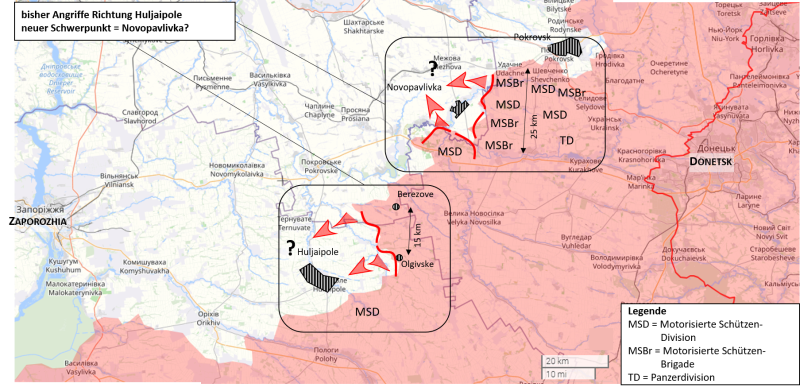 В регионе Гуляйполе между Донецком и Запорожьем, где до недавнего времени россияне наступали на фронте шириной в 15 км, сейчас, по-видимому, основное усилие смещается в район Новопавловки (3). Украинские контрнаступления с момента национального праздника Украины пока принесли лишь кратковременное облегчение (4). Впечатление замедления наступления, которое сложилось у некоторых западных наблюдателей, скорее всего, объясняется особенностями освещения в СМИ, а не реальными событиями.